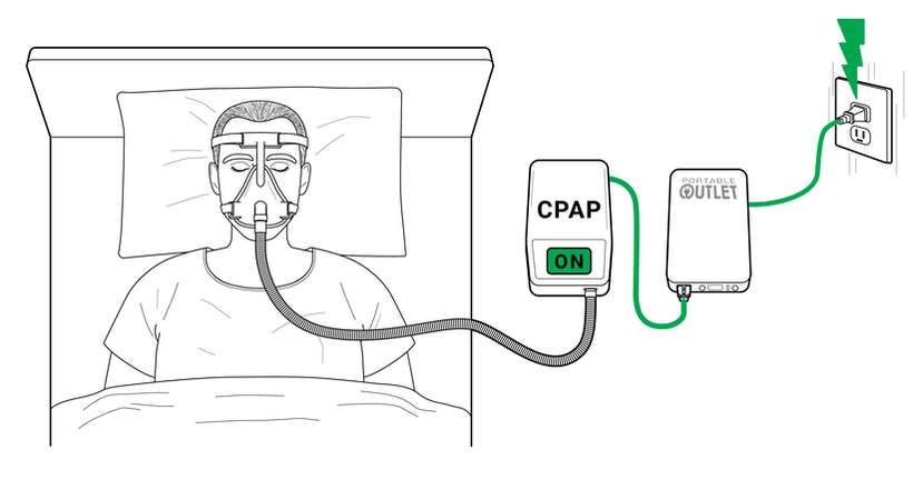 Simply plug your CPAP or BiPAP into your Portable Outlet and then into your wall outlet. While receiving your therapy, the battery stays fully charged.